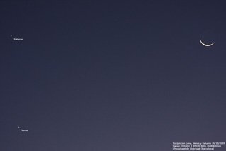 Luna, Venus y Saturno Posición en el cielo: Virgo Magnitud aparente: Luna: -9.55 Venus: -3.93 Saturno: 1.07 |