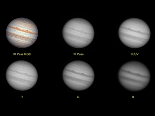 Júpiter LRGB: Fecha: 09/11/2011 Hora: 00:30h Telescopio: Celestron C11 Cámara: DMK21au618.as Método: Barlow x2.5 Exp: 1/91 Distancia Focal: 7000mm Filtros: LRGB Baader, IR Pass 685nm Guiado: NEQ6 Software: IC Capture v2.2 Imágen: Promedio de 990 de un total de 1370 Lugar de observación: L'Hospitalet de Llobregat (Barcelona) Tratamiento digital: Registax v5.1, Photoshop CS5
