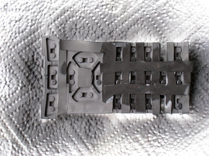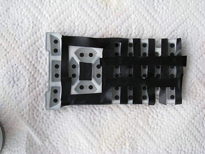 La vaporización es conveniente hacerla en un lugar bien ventilado y siguiendo todas las instrucciones que acompañan al producto. Debido a que la película de grafito es altamente conductora no hace falta bañar la membrana, aplicaremos una vaporización rápida, de una sola pasada y hasta que cubramos toda la zona. Una vez que se haya secado (unos 20 minutos aprox.) procederemos si cabe a retirar la cinta que habíamos colocado para proteger todo lo que no nos interesaba lacar siendo el resultado final similar al de la fig.12. Solamente nos queda limpiar aquellas zonas que han quedado impregnadas accidentalmente y sobretodo, si queremos que las teclas de nuestro mando sigan permaneciendo iluminadas también deberemos limpiar la parte posterior de estas (destacado en la fig.14).