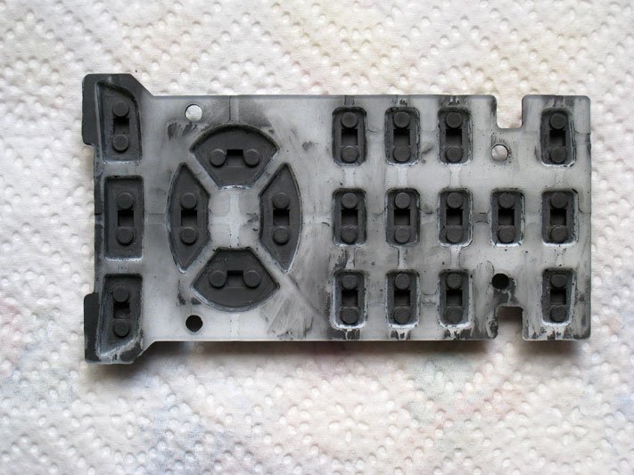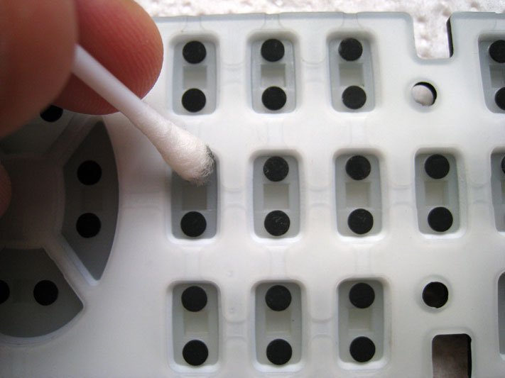 Ya está todo desmontado y listo para la reparación así que nos vamos a centrar en limpiar los contactos de la membrana del teclado de goma (fig.8) y todos los contactos del circuito impreso (fig.9), para ello he utilizado alcohol isopropílico ya que tiene la propiedad de que no ataca a la mayoría de plásticos, de no tener este tipo de alcohol recomiendo antes hacer una prueba en una de las esquinas de la membrana de goma para verificar que el alcohol no atacará al material en cuestión.