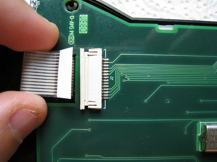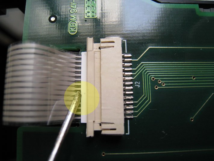 El desmontaje de la circuitería es relativamente sencillo y únicamente hay que considerar ciertas precauciones, la primera y más importante es descargar la electricidad estática que podamos tener para evitar dañar los circuitos integrados más sensibles, la segunda es con la cinta que viene de la pantalla y el conector que la retiene, en la fig.5 y fig.6 se muestra el método que he empleado para retirar la cinta sin producir daños. Una vez liberada solamente hay que cogerla de ambos bordes (fig.7), tirar de ella suavemente y saldrá prácticamente sola. Una vez desconectada pasaremos a levantar el circuito impreso con sumo cuidado de no tocar con los dedos ninguno de los contactos ya que el sudor de nuestras manos podrían oxidarlos en un plazo relativamente corto con lo que tendríamos de nuevo otra avería.