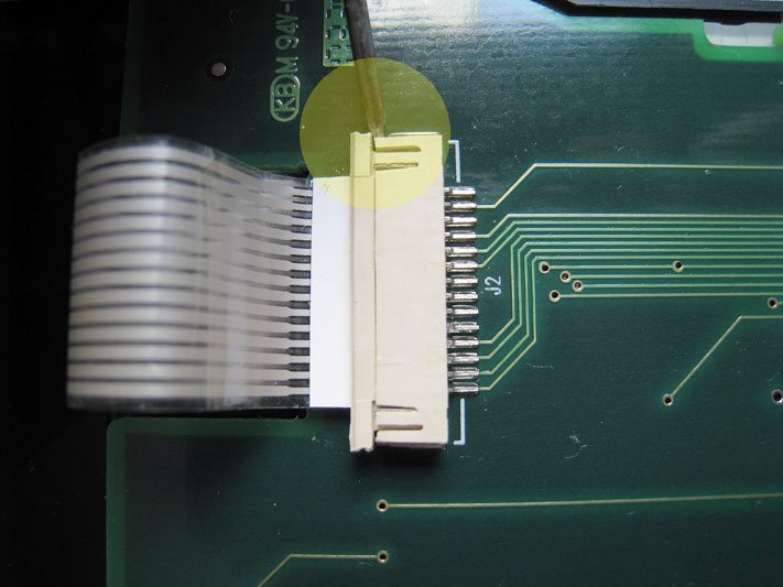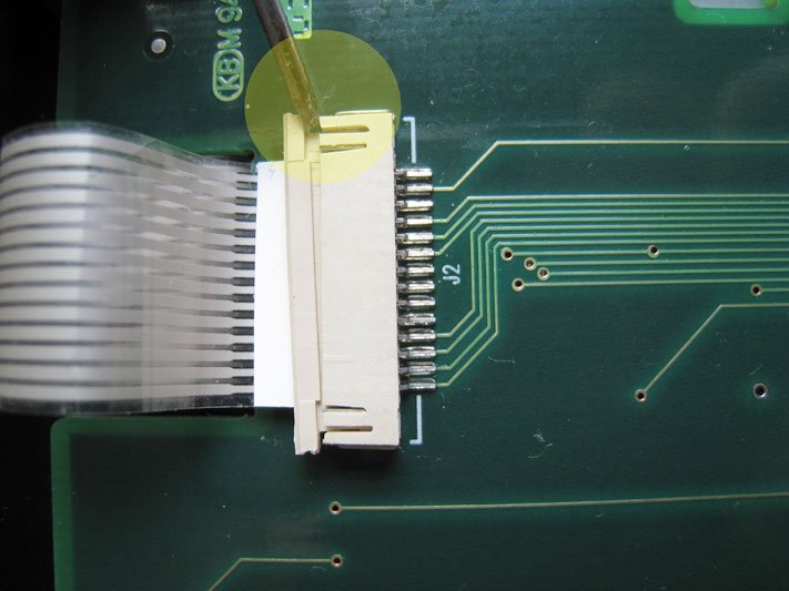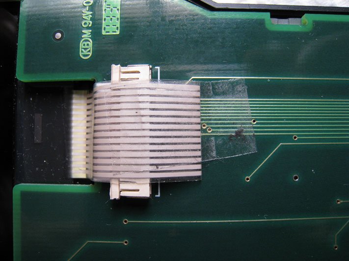 Una vez realizada la limpieza procederemos al montaje de la circuitería y de la cinta de la pantalla del mismo modo en que la retiramos, ya colocada en su sitio presionaremos levemente el seguro del conector del circuito impreso y esta quedará perfectamente retenida. Para evitar que la cinta vaya a parar hacia la pantalla en el momento de cerrar el mando recomiendo utilizar un poco de celo o cinta aislante para fijarla al circuito. Una vez cerrado solamente queda conectar el mando y verificar el correcto funcionamiento de todas las teclas. Si la operación se ha realizado correctamente el tacto y funcionamiento del teclado habrá mejorado notablemente, hasta tal punto que prácticamente no hará falta ejercer presión para que obedezca a nuestras ordenes.